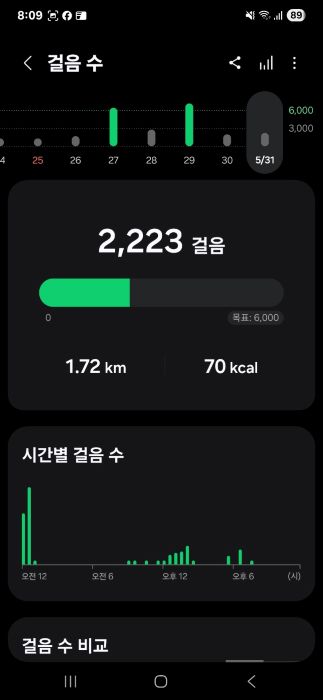 삼성헬스 앱에서는 일일, 주간, 월간 걸음수 통계를 한눈에 볼 수 있어요.