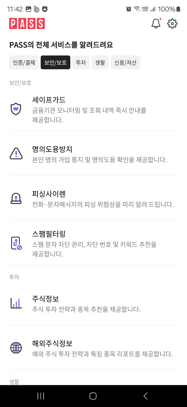 pass앱 보안/보호 탭 명의도용방지 가입하기